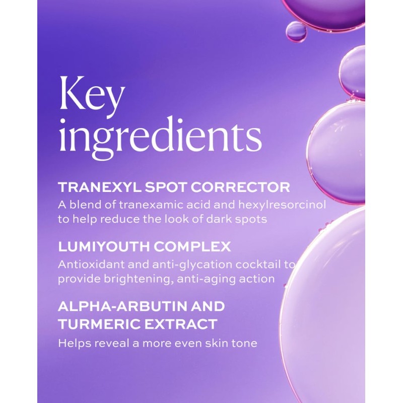 Този мощен озаряващ коктейл включва транексамова киселина и хексилреорцинол, за да помогне за подобряване вида на тъмните петна и да изравни тена на кожата. -