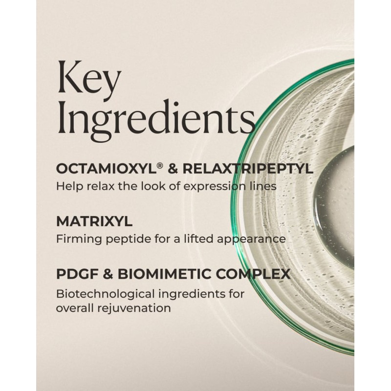 Този научен пробив включва някои от най-мощните активни съставки в индустрията — като пептиди за минимизиране на линиите, медни пептиди, Matrixyl и колаген — за да стяга, уплътнява и подобрява плътността на кожата.